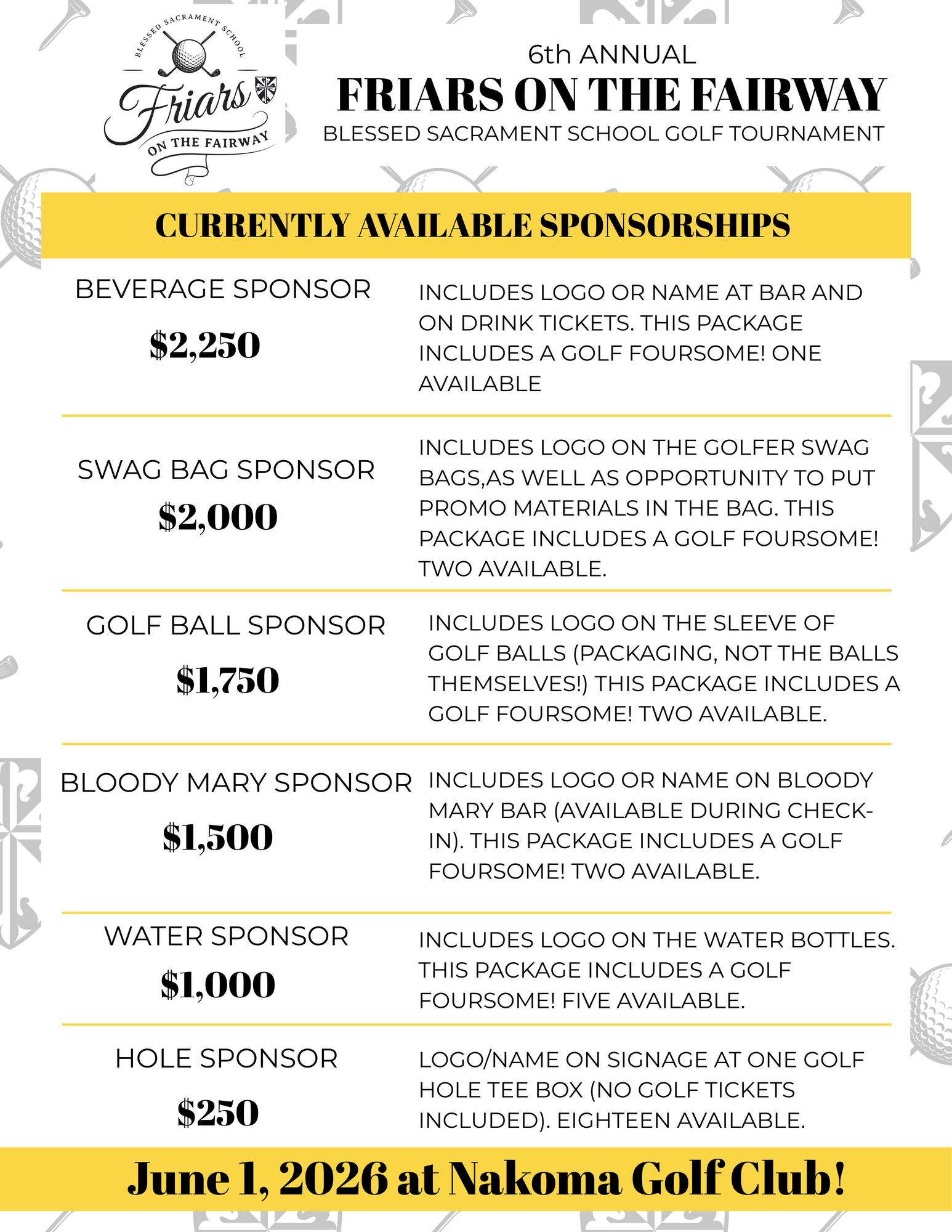 includes logo or name at bar and on drink tickets. this package includes a golf foursome! Tax deductible portion of sponsorship - $200.HOLE SPONSOR - $250 (18 available) logo/name on signage at one golf hole tee box. NOTE: no golf packages are included at this level. Tax deductible portion of sponsorship - $250.